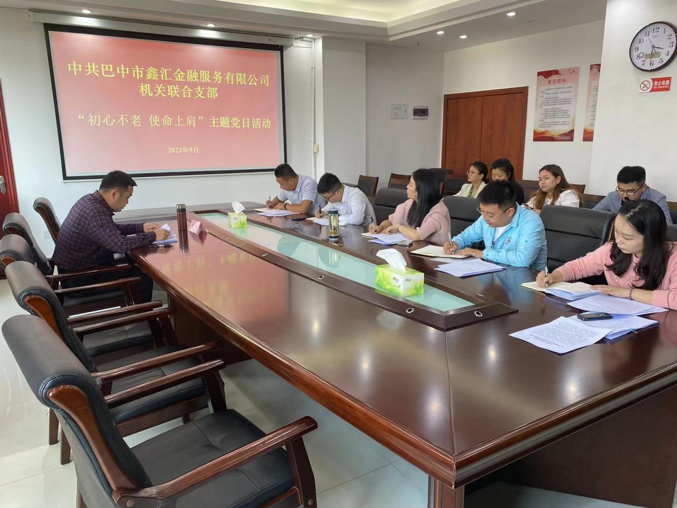 為進(jìn)一步加強(qiáng)基層黨組織建設(shè),切實(shí)發(fā)揮黨員干部的先鋒模范作用,9月28日,中共巴中市鑫匯金融服務(wù)有限公司機(jī)關(guān)聯(lián)合支部開展“初心不老 使命上肩”主題活動,機(jī)關(guān)聯(lián)合支部全體黨員、公司全體職工參加。